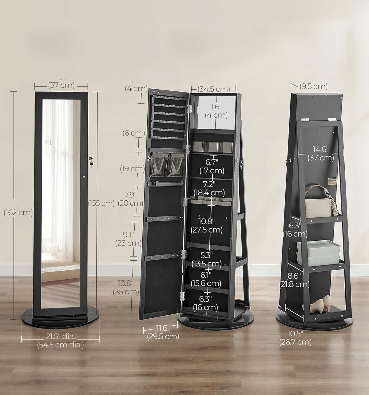Елегантна та функціональна, ця поворотна шафа для прикрас ідеально підходить для спалень, гардеробних, ванних кімнат або передпокоїв.