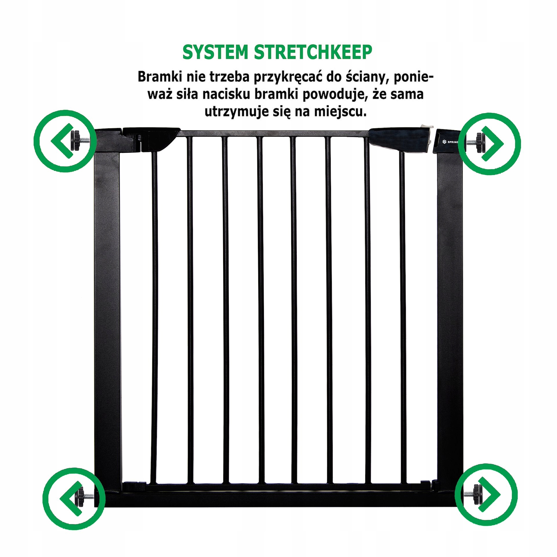 Безпечні, надійні захисні ворота для дітей або для дрібних і середніх тварин. Ворота можуть відокремлювати конкретні зони в будинку, які небезпечні для наших дітей. Він захищає сходи або двері від неконтрольованого проникнення дітей. Кріплення воріт здійснюється за допомогою спеціальних гвинтів, завдяки яким монтаж і демонтаж відбувається гранично просто і швидко. Регулювання дозволяє монтувати ворота між дверними коробками шириною 75-103 см.
